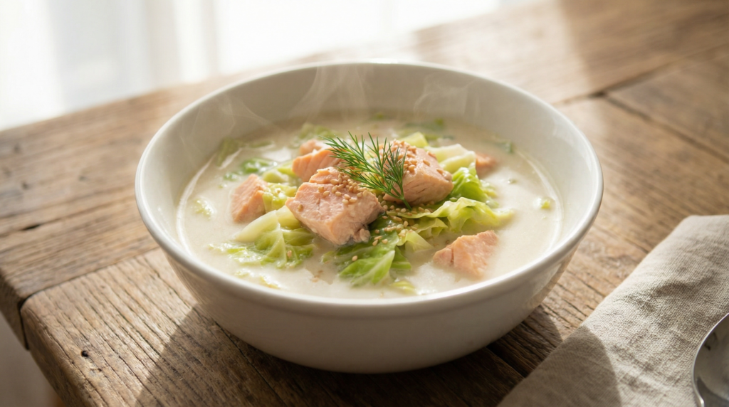 今夜の一品で整える春キャベツと鮭の酒粕豆乳チャウダー