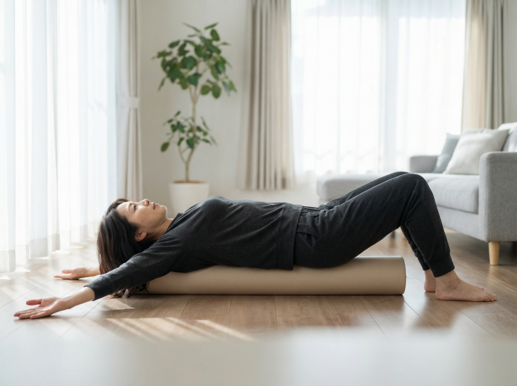 デスクワークで背中が固まっているなら、ストレッチポールの上に5分寝転がり、肩甲骨を緩めてみてください。