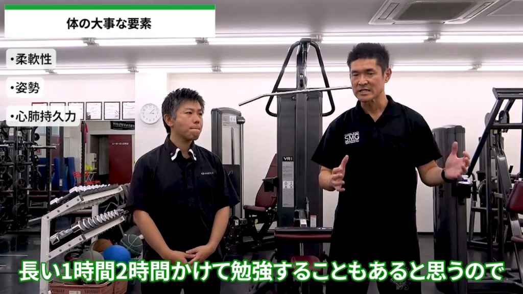 座っている時間が長いので、丸まった姿勢で勉強していたりすると、腰痛が出てきたりします。筋肉が硬くなって、そのまま姿勢が悪くなってしまう、ということも起こります。