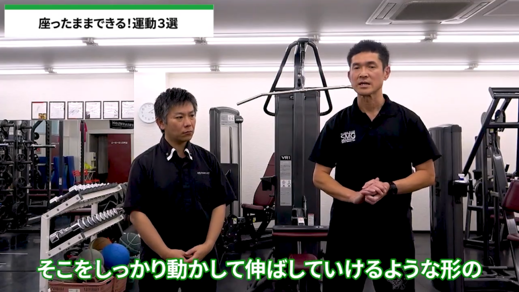 ずっと座っている姿勢で、腰がだんだん丸まったり、猫背になったり、同じ姿勢が長くなることで硬くなってきます。そこをしっかり捻りながら、伸ばしていくエクササイズを行います。