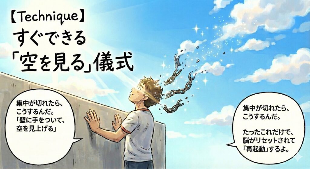 ポイントは、「同じ景色のまま頑張り続けないこと」。 視界を変えることが、集中力の再起動になります。