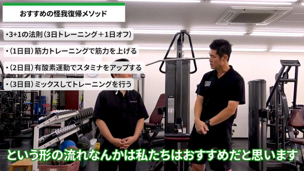 何か、おすすめの、これはベースとして、こんな雰囲気でやるといいよ、みたいな、おすすめ怪我復帰メソッドみたいなのってありますか?
